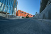 This stock photo features an empty road extending straight ahead with a wall on one side. In the background, there are several office buildings with futuristic architecture. The sky is clear and blue, providing a serene backdrop. The road is made of asphalt and there is a bridge and underpass visible in the distance. The image captures the bustling city life in a business district, specifically in Los Vegas, USA. The buildings cast hard shadows on the road, enhancing the urban vibe of the scene. The low angle of the image gives a dynamic perspective, emphasizing the modern architecture of the office buildings. Overall, this photo is a perfect representation of urban design and the fast-paced nature of the business world.