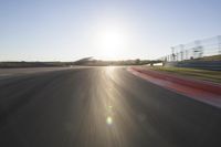 This is an image of a straight road on a clear sunny day. The asphalt road surface stretches into the distance, creating a sense of perspective. The sunlight illuminates the field on either side of the road, giving it a warm and inviting feel. The image is taken at dawn, with the sun visible in the clear sky. The motion blur suggests the fast-paced movement of automobiles, indicating that this road may be a highway or a race track. The road leads towards a stadium or a structure on the horizon. This photo captures the excitement of racing on a beautiful day.