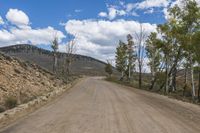 This stock photo depicts a straight road that cuts through the beautiful mountain landforms in a rural wilderness. The road is made of dirt and gravel, and it stretches as far as the eye can see. It leads to untouched natural landscapes, surrounded by tall trees and cloudy skies. The day is bright, showcasing the picturesque scenery. The photo captures the raw beauty of the wilderness and showcases the rural infrastructure in harmony with nature.