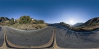 the 360 - angle view shows a straight road in front of a building and mountains