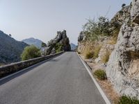 This is a stunning image of a winding road through the mountains in Spain. The road surface is smooth asphalt, surrounded by low vegetation and towering rock walls. The clear sky overhead provides a beautiful backdrop to the breathtaking landscape. The road leads to a mountain pass, offering a spectacular view of the Balearic Islands in the distance. The infrastructure includes an Armco barrier for safety. This photo captures the serene beauty of nature and the European charm of Spain.