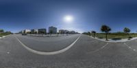 A straight road in Porto, Portugal, under a clear sky. Modern architecture lines the residential area with open spaces and parking lots. Urban landscape showcasing European architectural trends.