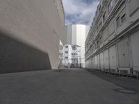 This is an image of a city street in Berlin, Germany. The straight road is lined with modern architectural buildings and factories. The white concrete facade of the buildings contrasts with the low brick walls. The road surface is made of asphalt, creating a smooth lane for the urban infrastructure. In the courtyard, a museum stands, representing the city's cultural heritage. The image showcases the industrial and urban design of Berlin. The hard shadow cast by the buildings adds depth to the metropolitan area. This photo captures the essence of city life in Europe.