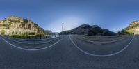 a 360 - ray lens photo of a highway through a fish eye view image of the valley