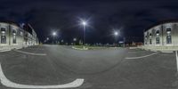 A monochromatic view of a straight road lined with residential buildings and streetlights. The road leads to a parking lot in the middle, creating a symmetrical urban design. Classic architecture and artificial light add to the city's charm.