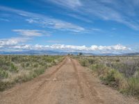 A straight road in rural Colorado, USA. Dirt and gravel street surrounded by natural landscape. Clear sky contrasts with clouds overhead. A scenic day for a drive in the countryside.