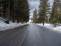 an empty road surrounded by snow and trees in the winter time, near a mountain