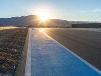 This is an image of a straight road in the USA, with asphalt shining under the first light of dawn. The sun is visible on the horizon, casting a warm glow over the race track. The sky is filled with fluffy clouds, adding depth to the scene. This picture captures the tranquility of the break of day and the excitement of racing. The sun shines brightly, creating a sunny and sunny atmosphere at the race track.