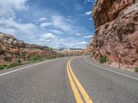 A straight road stretches through the Utah landscape, lined with asphalt and framed by the beauty of nature. The clear sky and clouds add depth to this scenic view in the USA.