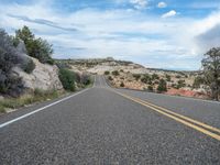 Straight down the road in Utah, surrounded by scenic nature landscapes. Clouds fill the sky on a beautiful day. The asphalt road leads to the famous Head of the Rocks. A perfect American road trip.