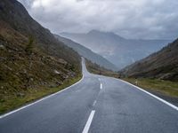 A gloomy and dramatic landscape in Austria. The straight road, wet from the rain, leads through the highlands and mountains. The grey sky adds to the atmosphere. This view is from the Timmelsjoch pass.