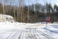 A scenic landscape photo taken during the day in Canada. The photo shows a straight road covered in snow, surrounded by a beautiful forest with tall trees. The road surface is made of asphalt, and there is a branch covered in snow hanging over the road. The clear sky and freezing temperature create a serene atmosphere. This image portrays the tranquility of nature and the untouched beauty of the Canadian wilderness. The road leads straight through the forest, inviting the viewer to imagine going on a journey. This image is perfect to illustrate themes related to travel, adventure, and the natural wonders of Canada.