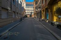 This image captures a quiet street in Strasbourg, France. The straight road is surrounded by beautiful classic architecture and storefronts. The clear sky above casts hard shadows on the asphalt, creating an urban atmosphere. The narrow alleyway provides a unique urban design, with the cityscape in the background. This photo represents a typical day in Strasbourg, with opportunities for shopping and dining out at the various restaurants and shops along the road.