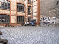 This stock photo captures the vibrant city of Berlin, Germany. The image shows a cobblestone road running through a residential neighborhood with classic architecture. The graffiti-covered walls and vibrant street art add an artistic touch to the urban landscape. The open spaces and courtyards provide peaceful retreats amidst the bustling city. The photo also showcases the unique urban design with warehouse-style buildings converted into cafes and shops. The image perfectly represents the dynamic city life of Berlin, blending cultural heritage with modern elements. The photo was taken during the day, highlighting the beautiful flooring and surfaces. Explore the vibrant streets and immerse yourself in the art district of Berlin, Europe's artistic hub.