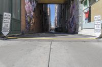 This is an image of a road in downtown Denver, Colorado, USA. The straight road is lined with classic architecture and concrete sidewalks. The low-rise buildings create a unique urban design. The road surface is made of yellow asphalt, providing a vibrant contrast to the city life. The image also captures a public space with graffiti on the wall in an alley-way. The side road leads to a small road and a driveway. This photo showcases the unique urban infrastructure and architectural features of downtown Denver.