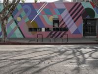 A vibrant street art mural adorns the concrete wall in downtown Los Angeles, California. The colorful design brings life to the urban landscape. The pink graffiti wall stands out against the city's architecture and bustling city life.