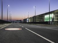 A street light illuminates a building on a road surface made of asphalt. The lines on the thoroughfare add to the urban design, creating a mode of transport for vehicles.