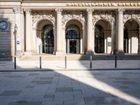 This stock photo showcases a street scene in Hamburg, Germany. The image captures the shadow of a person walking along the sidewalk of a building. The classic architecture of the building contrasts with the modern road and open space. The concrete structures and reflection add depth to the composition. This photo beautifully represents the charm of European cities, particularly Hamburg.