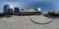 A snapshot of the vibrant city life in downtown Toronto. The fisheye lens captures the modern architecture, high-rise buildings, and bustling streets. Clear skies and urban design make for a captivating view.