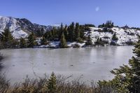 This is an image of a snow-capped mountain in Colorado, USA. The mountain is reflected in a frozen lake surrounded by trees. The clear sky and sunlight add to the beautiful landscape. The snow-covered water and trees depict the winter season. This photo represents the natural beauty and wilderness of Colorado, making it a popular travel destination. It can also be used as a backplate or plate for various projects related to nature, landscapes, and travel.