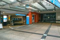 a bus station with an indoor sign and a television set outside it's front door