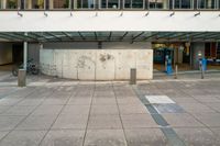 This image captures the urban design of Stuttgart, Germany. The photo shows an empty bus stop with a bicycle parked next to it, near a wall and windows. The city's vibrant atmosphere is evident with the cafe, shops, and restaurants lining the street. The surface plaza is bustling with activity, providing a perfect spot for people to eat out or enjoy outdoor seating. The parking deck and garage offer convenient parking options for visitors. This image represents a typical day in the city, showcasing the blend of urban elements and the unique architecture of Stuttgart.