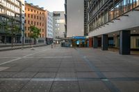 This is an image of an empty city street in Stuttgart, Germany. The tall buildings surround the street, creating an urban landscape. The clear sky highlights the modern urban design, with storefronts and restaurants lining the street. In the middle of the street, there is a crosswalk for pedestrians. This photo captures a typical day in Stuttgart, where people can eat out, shop, and enjoy the urban amenities. The parking deck and plaza next to the street provide convenient parking options for visitors.