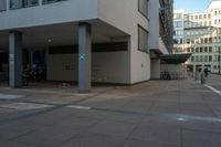 A bustling urban plaza in the heart of Stuttgart, Germany. Clear skies provide the perfect backdrop for outdoor cafes and shops. The building entrance features bicycles, a symbol of the city's urban design.