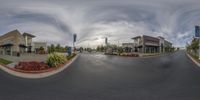 A fisheye shot of two shops in a suburban neighborhood. The sky with clouds serves as a backdrop to the vibrant architecture and urban design. A perfect day to explore the residential area.