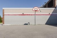 This stock photo captures a unique scene of a basketball hoop standing alone in a parking lot adjacent to a building in a suburban neighborhood in Toronto, Ontario, Canada. The low-rise architecture of the surrounding homes and the concrete facade of the building create an urban backdrop. The clear sky overhead illuminates the open space, showcasing the elevated basketball hoop against a backdrop of asphalt and brick wall. The image represents the unique blend of suburban and urban elements found in Toronto's real estate and property landscape.