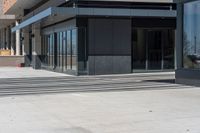 a person wearing a hat is walking outside of a business building that has glass doors and windows