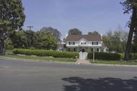 there is an old white house in the suburbs of california on this street that looks great with a lot of grass and bushes