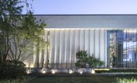 an exterior photograph of a modern house with trees in front of it in the evening