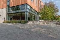 there is a clock that is on the ground outside of this building and is in front of some trees