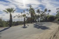 A view of a suburban cityscape with a road lined with residential properties. The asphalt road stretches into the distance, surrounded by trees and vegetation. The city skyline is visible in the background, under a cloudy sky.