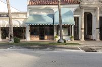 a small street lined with storefronts and palm trees in a corner area with blue, white, and tan awning