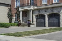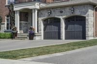 This is an image of a residential area in Toronto, Canada. The clear sky above highlights the architecture of the houses and buildings in the neighborhood. The roads and walkways are made of asphalt, while the driveways and parking garages are made of different surfaces like stone, brick, and concrete. The houses have various facades, with stone walls, brick walls, and porches. The well-maintained lawns and vegetation add to the charm of the neighborhood. This photo represents a typical day in a suburban area in Toronto.