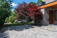 brick driveway in front of a modern home with a door and brick patio area that has colorful trees and shrubs on the other side