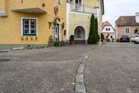 This is an image of a suburban neighborhood with classic architecture. The photo captures a road with an asphalt surface that curves between residential buildings. The yellow walls of the houses add a vibrant touch to the scene. The estate features cobblestone paths and land lots. The real estate properties are a combination of concrete and classic architecture. The surrounding area is landscaped with dirt and gravel. This photo depicts a typical day in a residential town with a mix of modern and classic architecture.