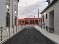 A view from a window looking down a straight road in a suburban neighborhood at dawn. Classic architecture and street lights illuminate the scene. Residential areas lined with trees and guard rails provide a picturesque view of city life.