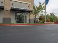 A suburban neighborhood lined with trees and street lights. The road surface is made of asphalt, with storefronts and restaurants offering dining and shopping options. Clouds fill the sky on a typical day in this residential area.