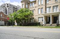 A picturesque suburban residential area in Toronto, Canada. The low-rise apartment buildings and houses line the quiet streets. Lush trees and a clear sky create a serene atmosphere.