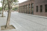 This image showcases the classic architecture of a suburban neighborhood. The brick buildings have beautiful facades with windows and walkways. The tree-lined road surface adds to the charm of the area. A public space with a concrete walkway and curb can also be seen. The structures and walls of the buildings reflect the timeless beauty of the neighborhood. This photo captures the essence of a peaceful day in a suburban setting.