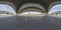 there is an upside down shot of a parking lot underneath a large overpass bridge