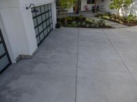 A clean and ready-to-be-painted patio in a suburban home. The patio flooring is a silver composite material, while the black door creates a striking contrast. The open space is surrounded by lush vegetation.