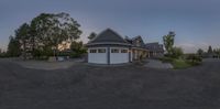 the view from behind of a driveway area at dusk, shows the garages and the driveway