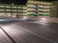 A suburban road in Los Angeles, illuminated by street lights and the green glow of a parking deck. The dark night sky contrasts with the artificial light, creating a captivating urban scene.