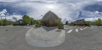 the view is distorted in a fisheye lens on a street corner with houses, trees, and buildings