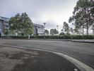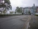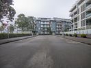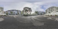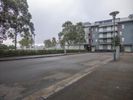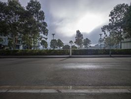 An empty street in a suburban residential area, lined with buildings and shaded by trees. Sunlight casts shadows on the road surface, creating a gloomy atmosphere. A stop sign stands in the middle, adding to the urban design.