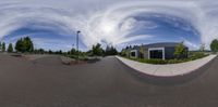 A panoramic view of a small skateboard park on a suburban street surrounded by buildings. Clear sky and open space create a vibrant urban design. The residential area showcases a variety of architectural styles.